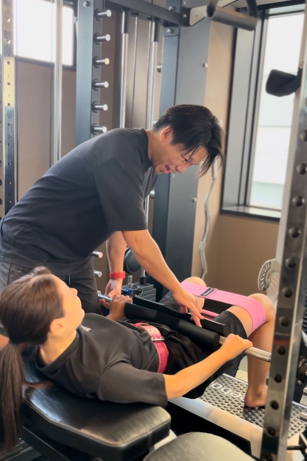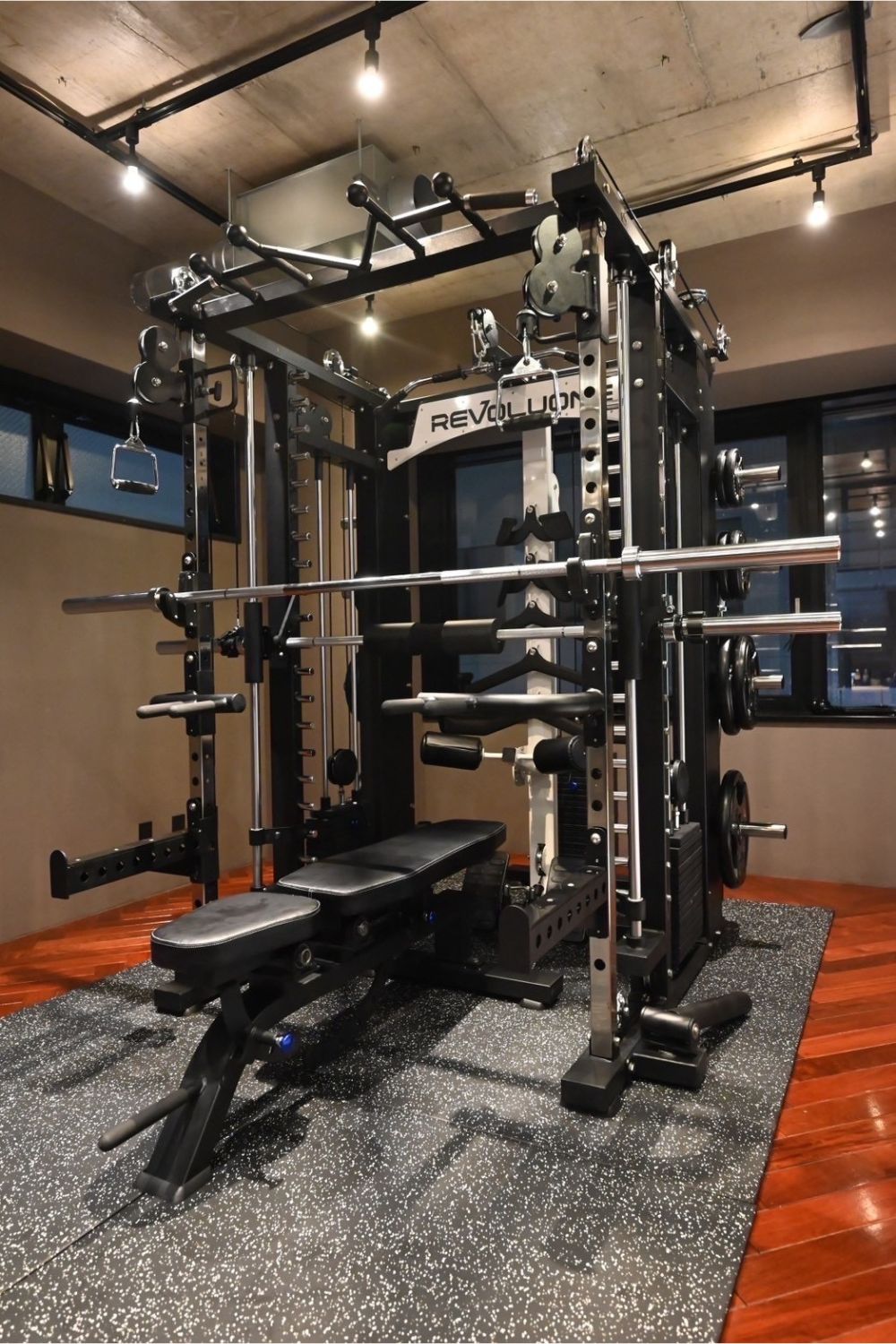 オールインワンスミスマシンを使用したトレーニングで、効率よく全身を鍛えます。スミスマシンはフォームの安定性が高いため、初心者でも安全にトレーニングを行うことができます。 -